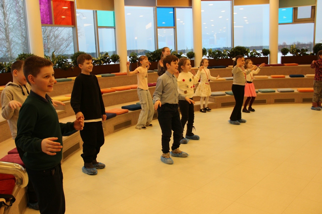 На неё собрались наши ребята из разных творческих клубов. Они столько трудятся в школе, в садике да ещё и у нас на занятиях, что такая зарядка для них – отличный способ отдохнуть и укрепиться. А помогал нам её проводить весёлый мультяшный утёнок. Он показывал движения, и мы все повторяли за ним. Вот это мы понимаем – тренер!